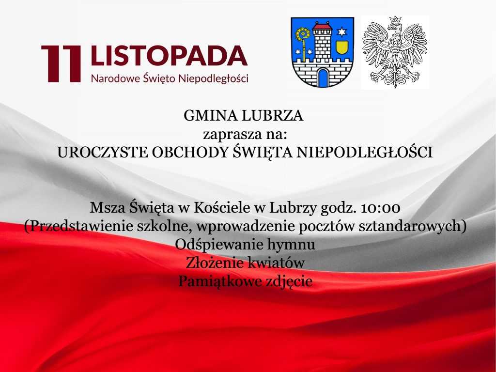 Gmina Lubrza zaprasza na Uroczyste Obchody Święta Niepodległości. Msza święta w Kościele w Lubrzy godz. 10:00 Opublikowano 6 listopada 2024 przez admin Gmina Lubrza zaprasza na Uroczyste Obchody Święta Niepodległości. Msza święta w Kościele w Lubrzy godz. 10:00 Skomentuj
